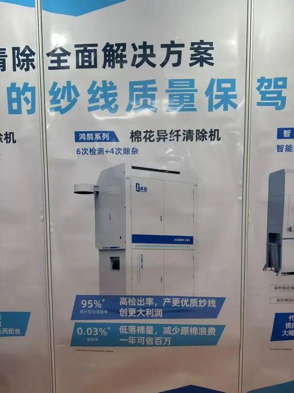 异纤清除,是后道对纱厂的要求,特别是在染整时,异纤会纤毫毕露。异纤机已经是生产全棉类纱线企业的必备设备。智目智能也参加了本次展会,但没有带样机过来。资料显示,鸿鹄系列异纤机已经升级换代,新的鸿鹄异纤机和原来机型相比,异纤综合清除率可以达到95%,而落棉率只有0.03%,且外形尺寸比原来要小一些。