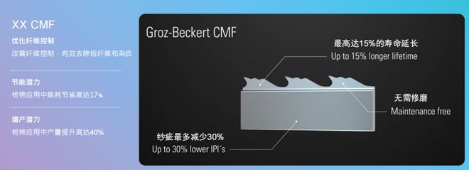 XX CMF锡林针布采用双驼峰设计,针尖和两个驼峰的高度逐步递减。生产时,双驼峰不仅能有效托持住纤维,还能借助气流使纤维尾端上扬,从而使另一针面的针齿能够更加有效地抓取纤维,梳理和纤维转移效果都明显提升。这款针布的具体参数为:高度1.8mm、基厚0.38mm、齿距1.7mm,每平方英寸1000齿。据介绍这款针布不用磨针,可增加15%的寿命。从纺纱企业的实际对比数据来看,用它生产的生条棉结、筒纱细小纱疵都显著减少。