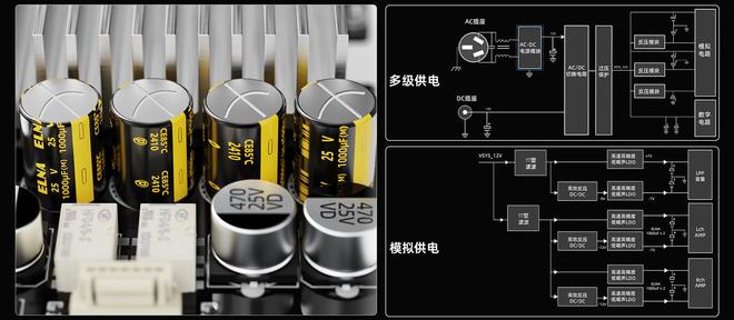 此外,内部供电用料毫不含糊。整机采用了多达18颗低噪声LDO精密稳压IC,5颗DC-DC,提供多路专业供电,为音频输出提供强劲的动力支持,还精选丝膜材质的ELNA RA3系列音频电容+音频专用钽电解电容,为整机提供纯净、稳定的电源供给,声音温润、自然。